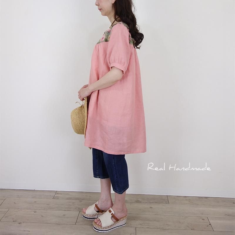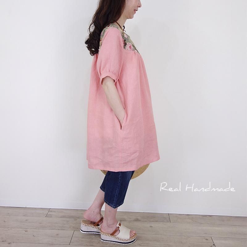 ローズヨークのコーラルピンクフレンチリネンワンピース