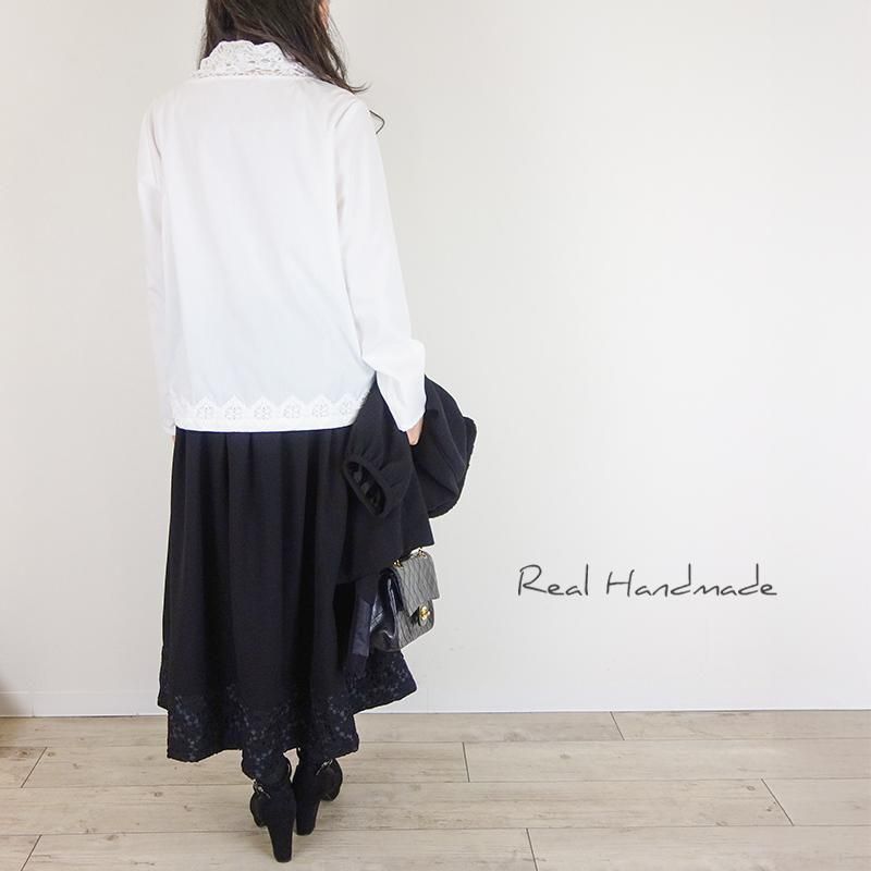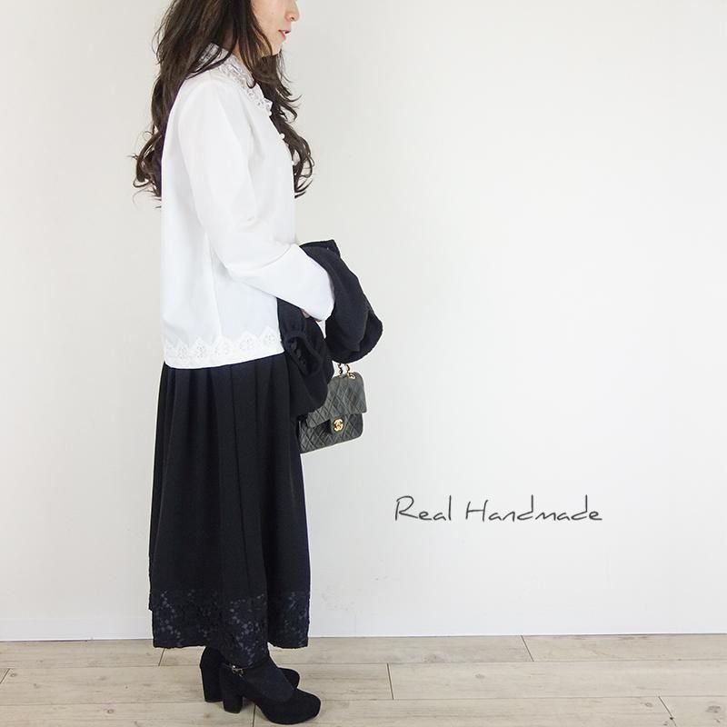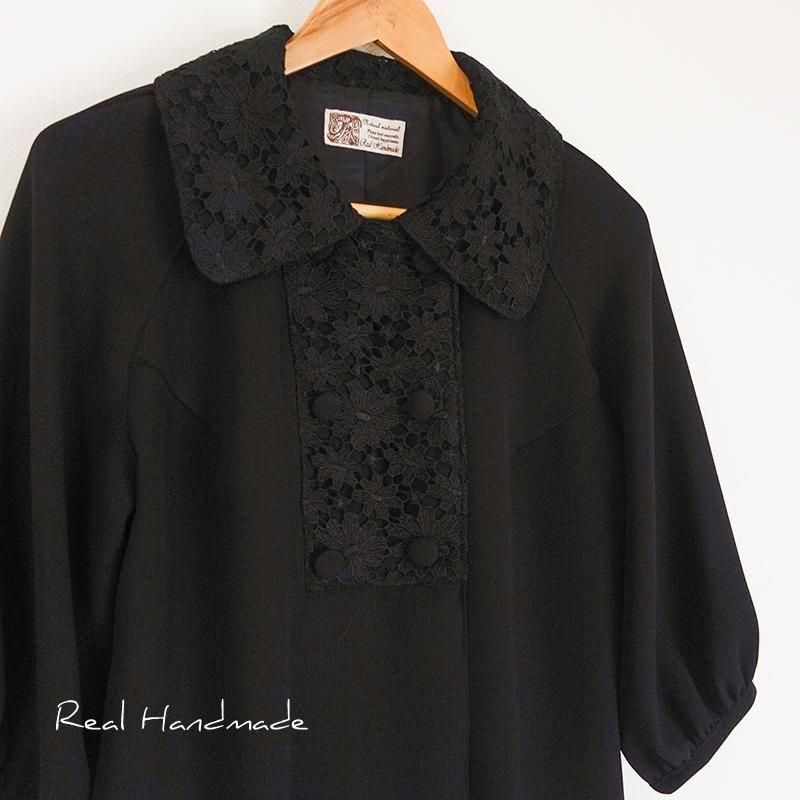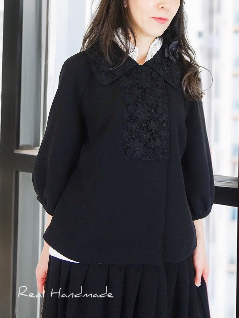 襟と胸元には繊細なフラワーモチーフのブラックケミカルレースを重ねて、