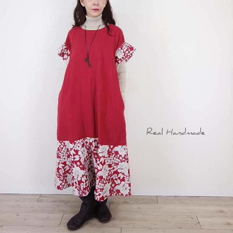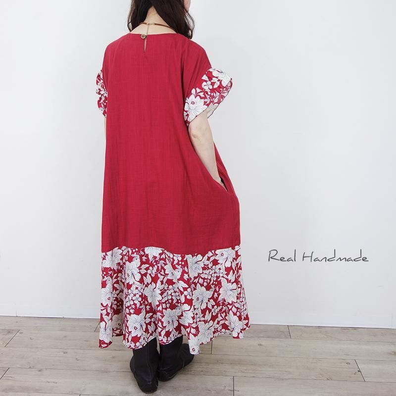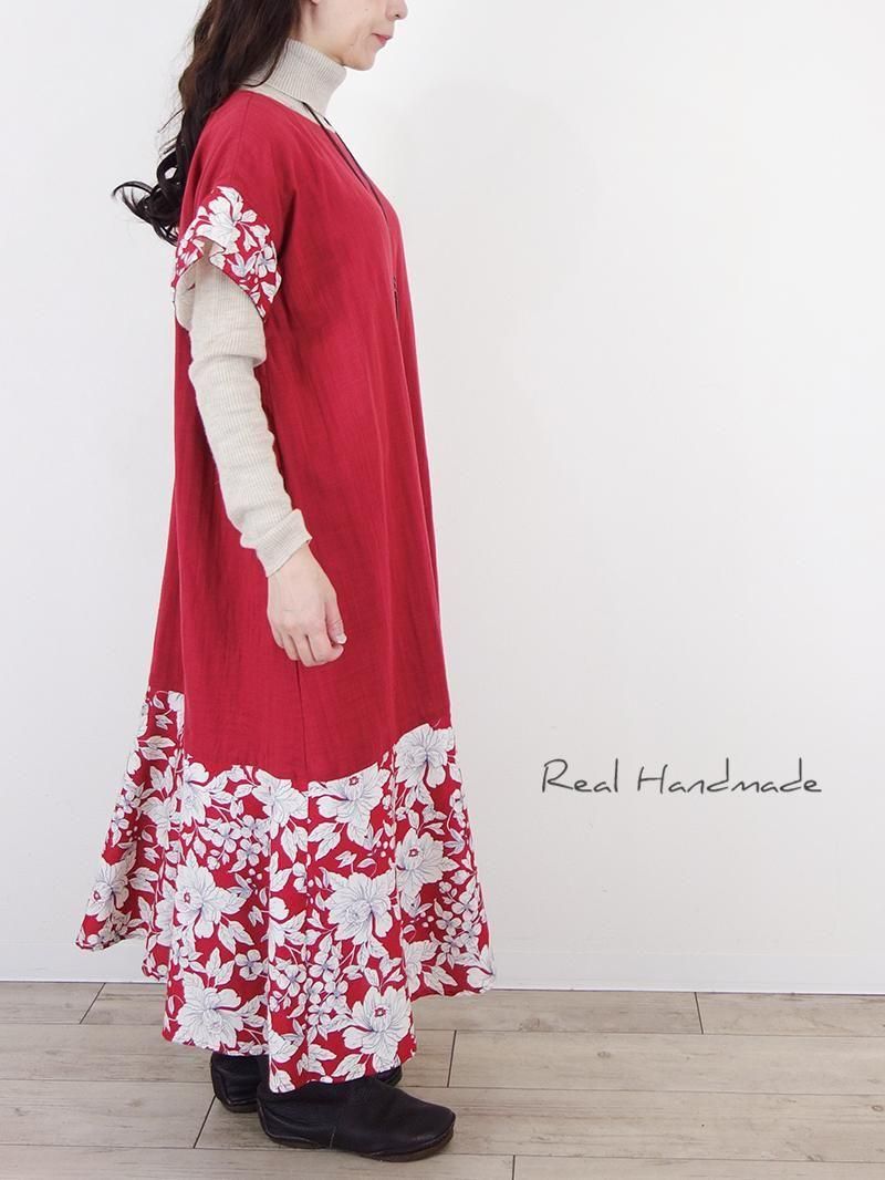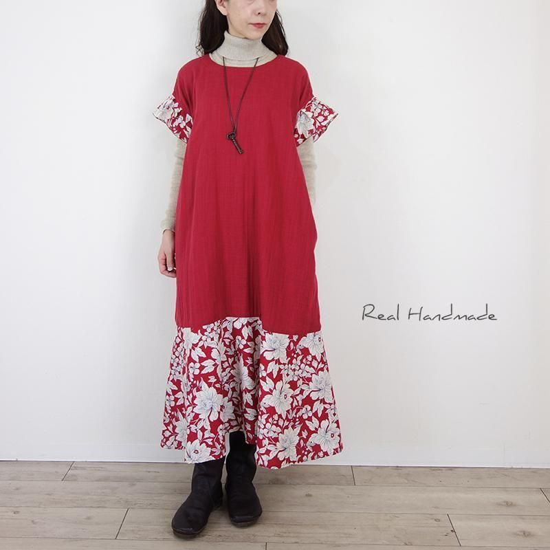 グレナディンレッド・揺れるフリル袖と花模様のスラブWガーゼワンピース