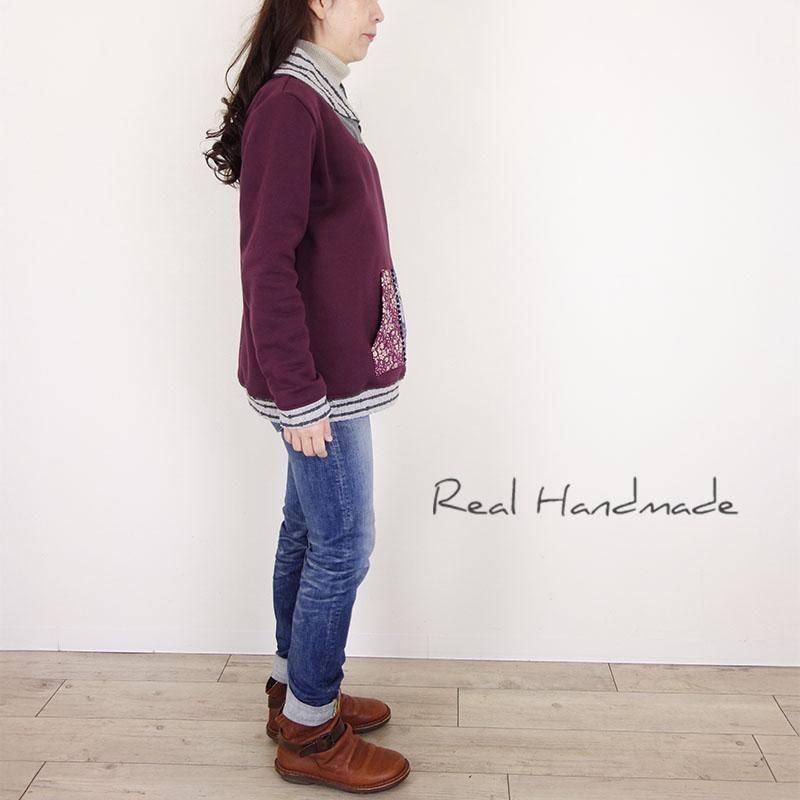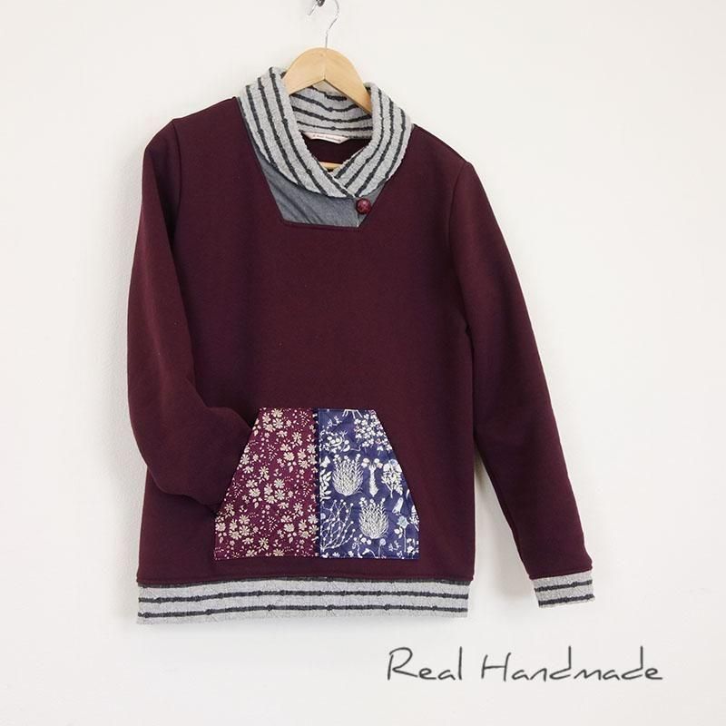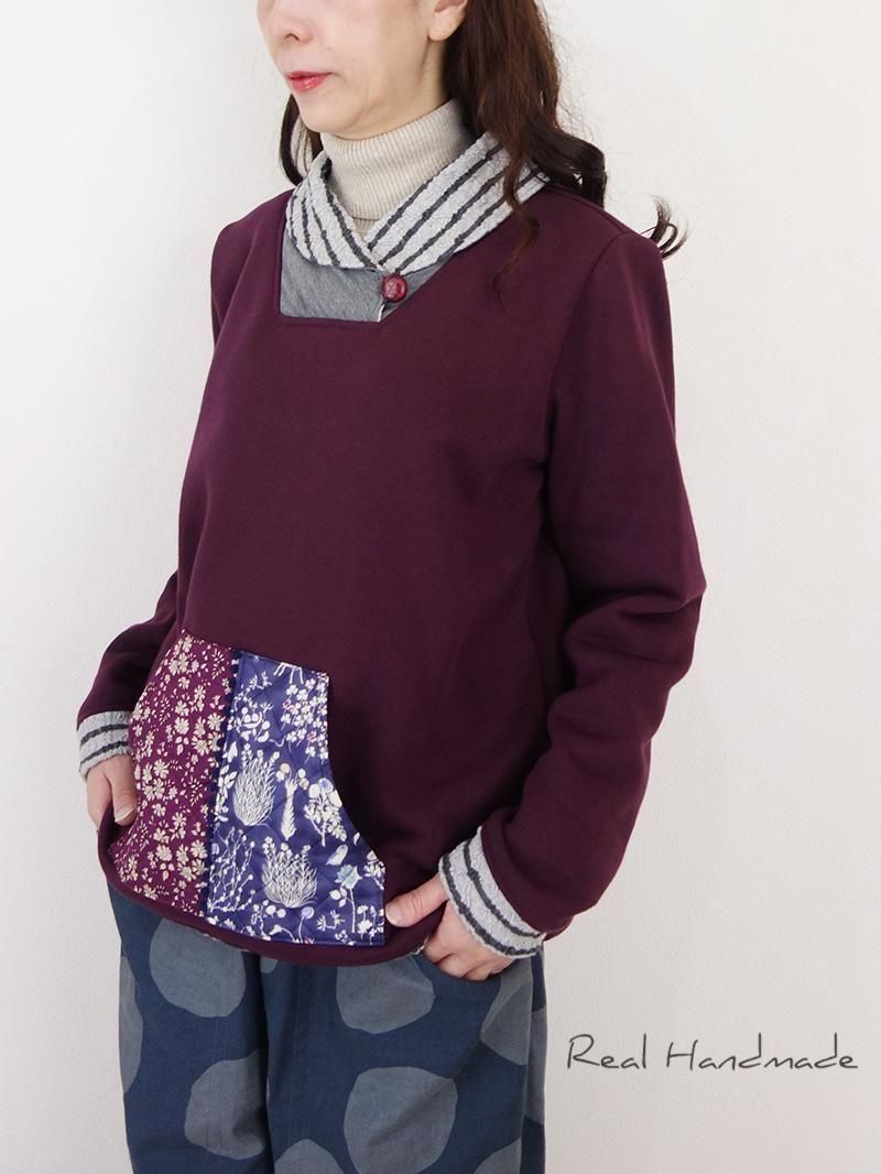 ボルドーリバティカンガルーポケットショールカラープルオーバー