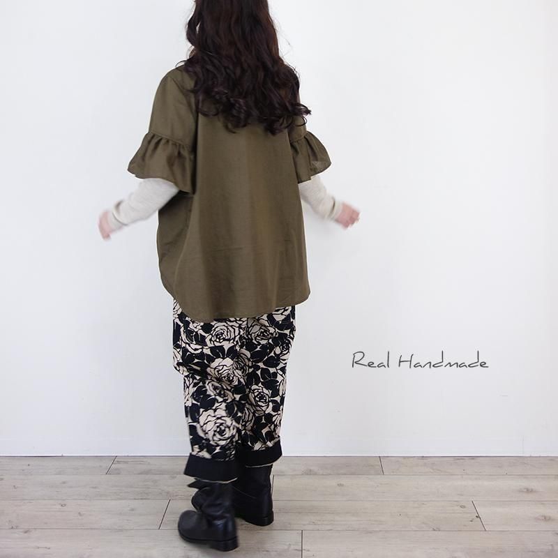 カーキコットンリネン・イレギュラーヘム袖フリルプルオーバー(セットアップ可)