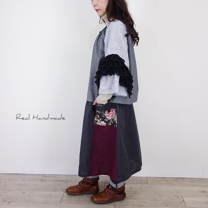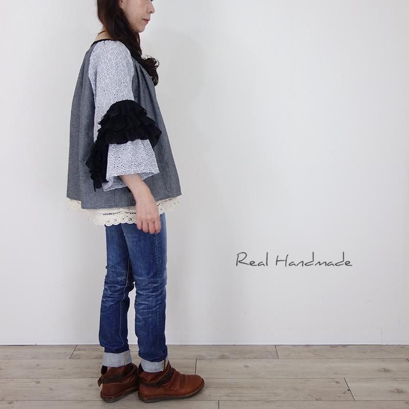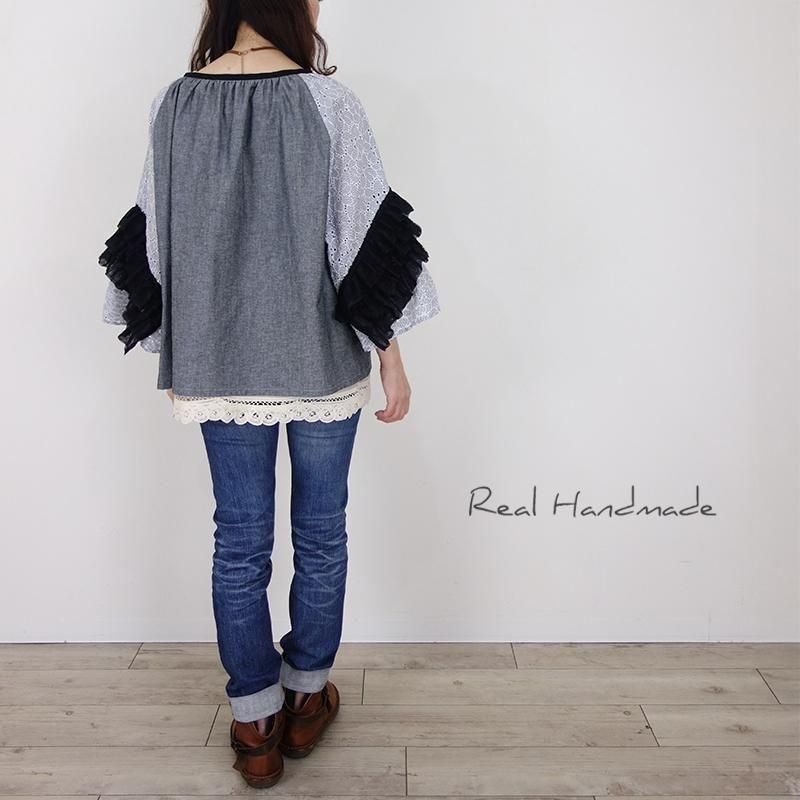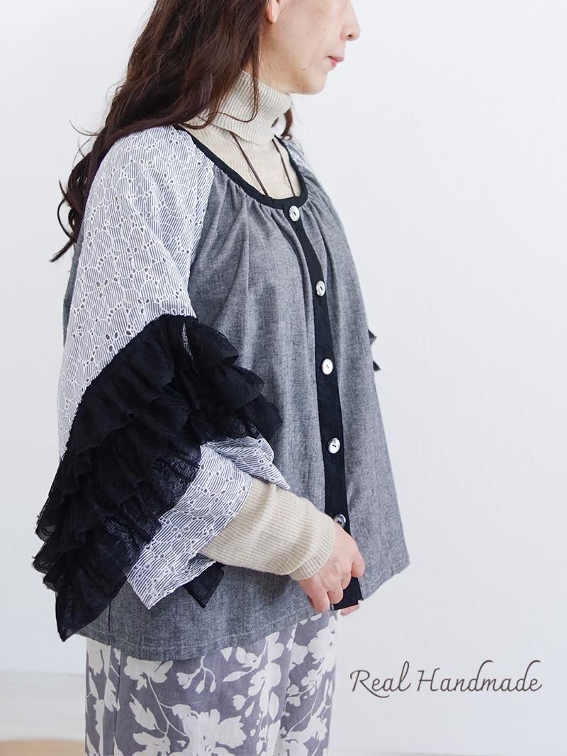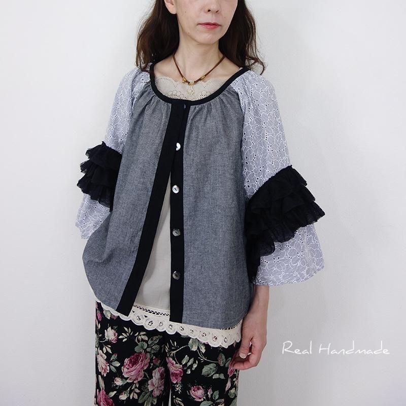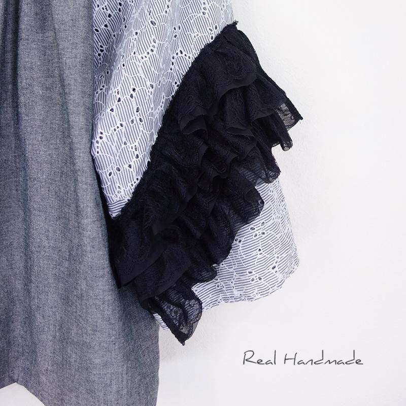 袖にはストライプ生地に花形レースが施された素敵な刺繍コットンを合わせて、