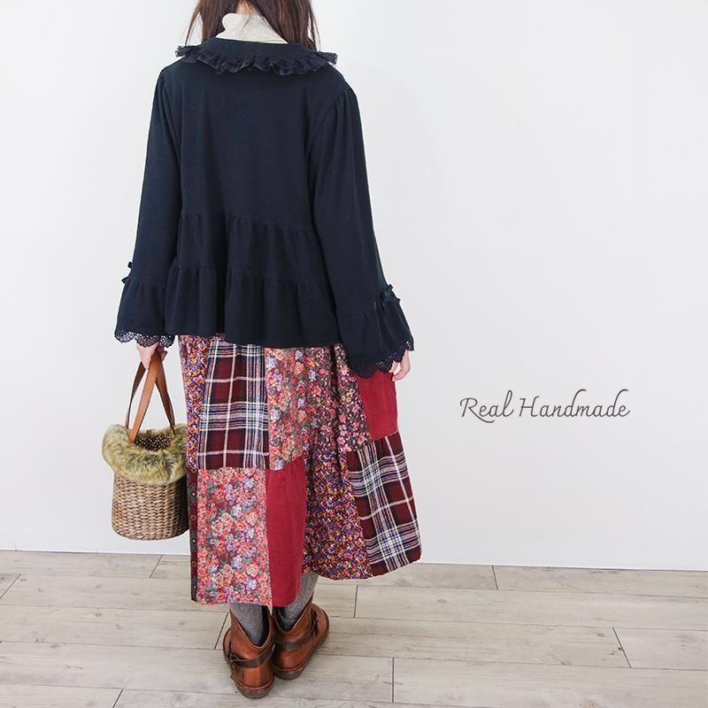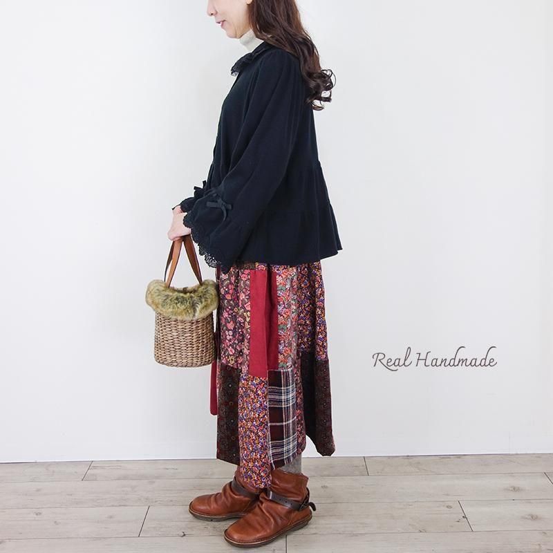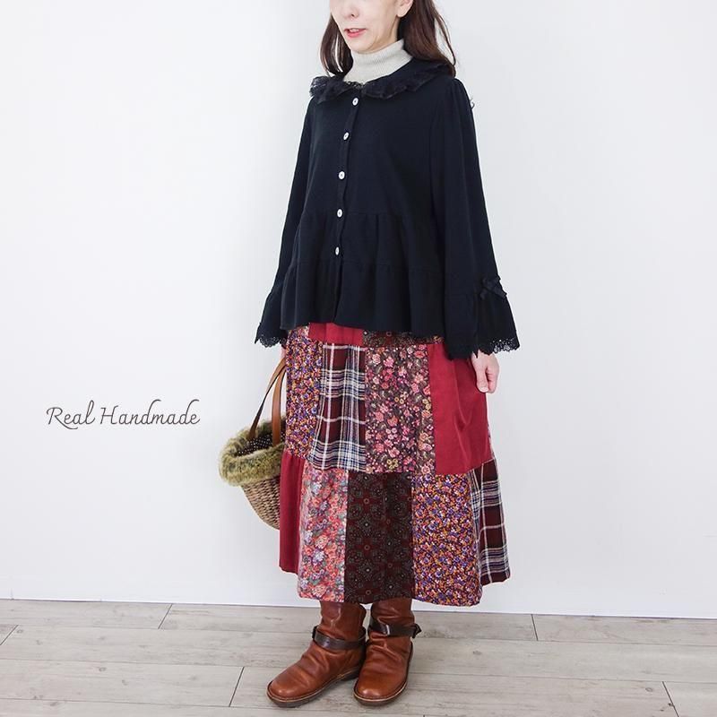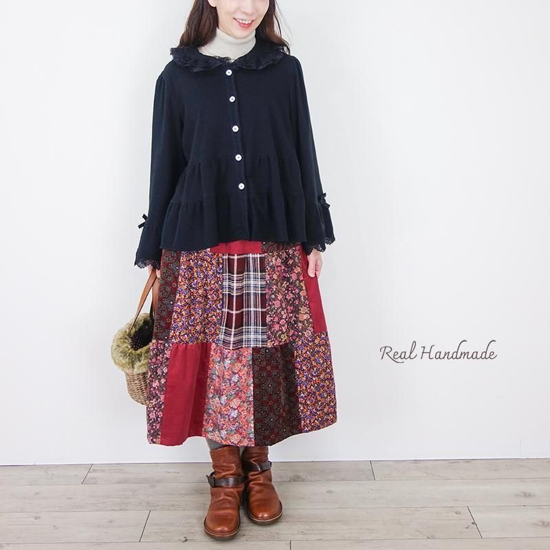 リネンパッチティアードスカート☆アンティークボルドーフラワー