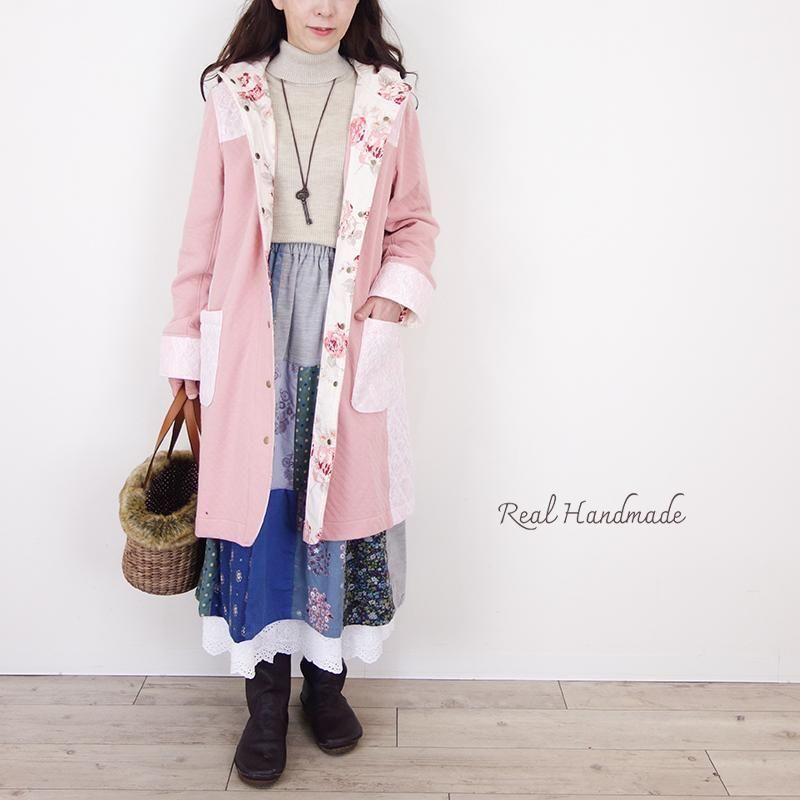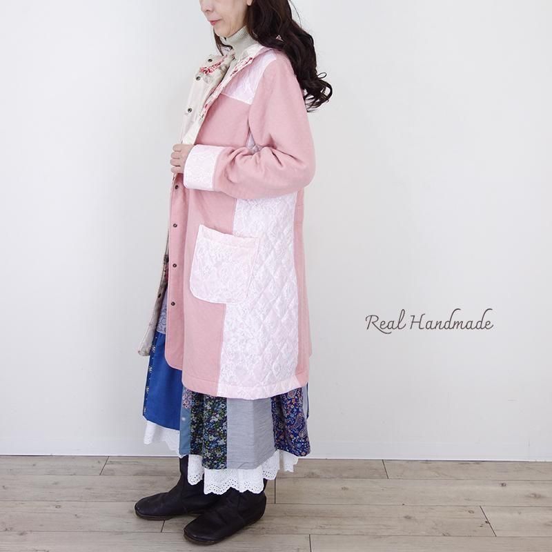 キルトニットピンクとフラワーレースキルト・パーカーコート