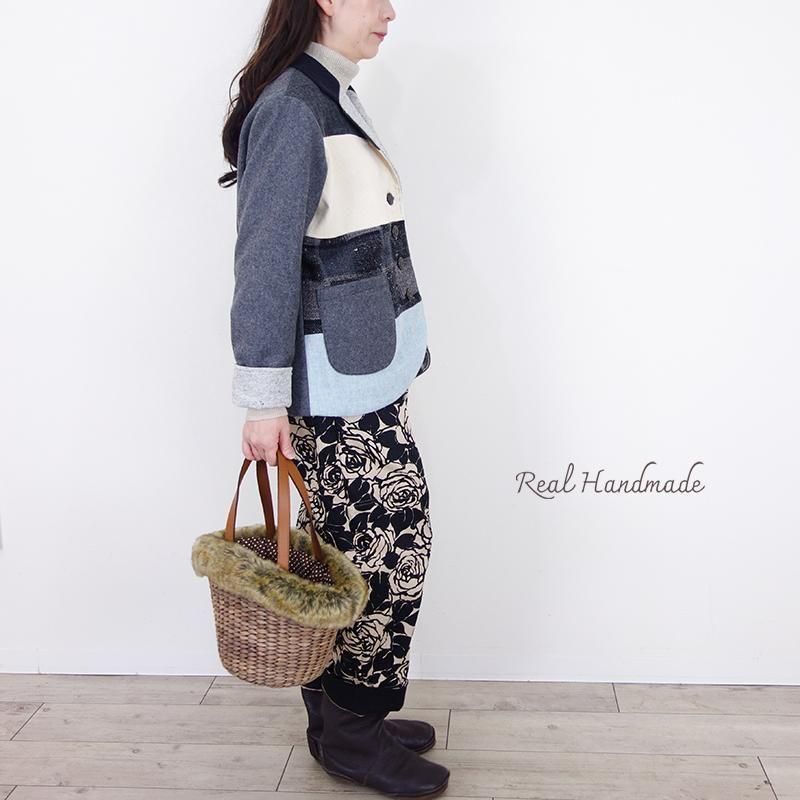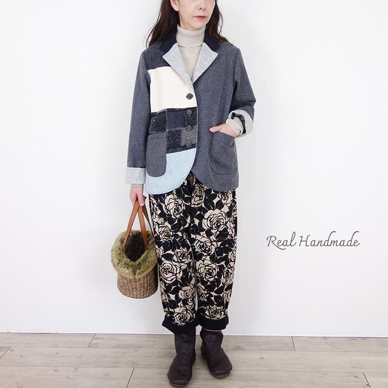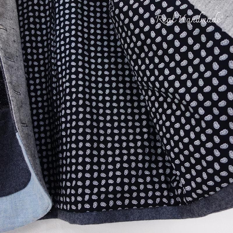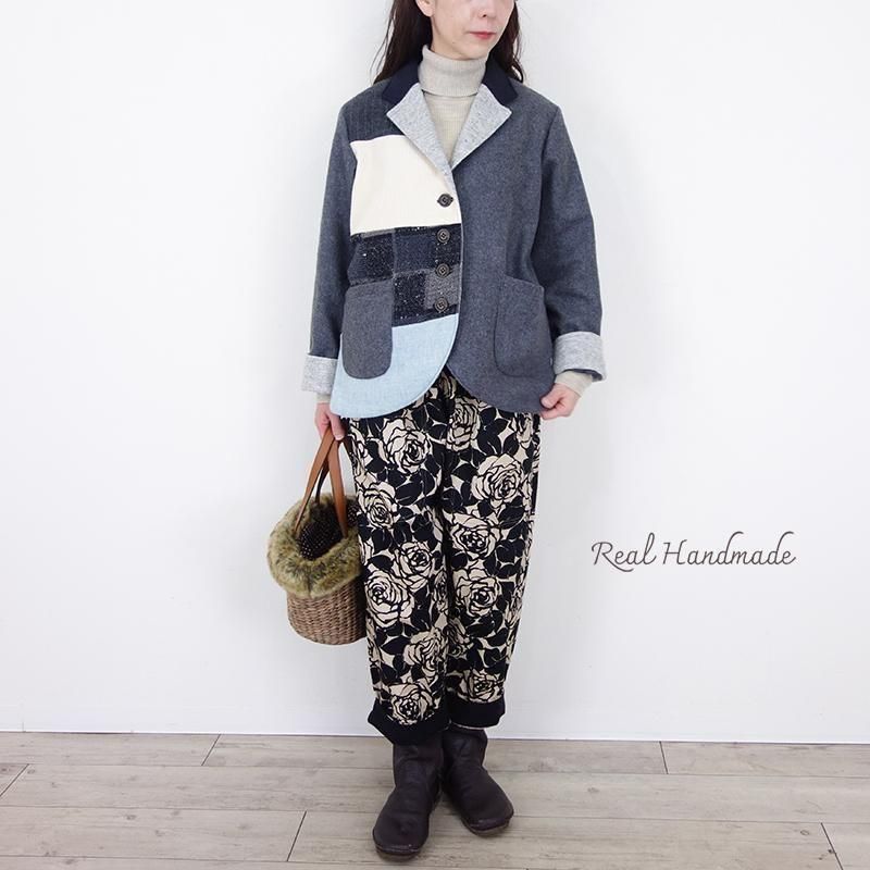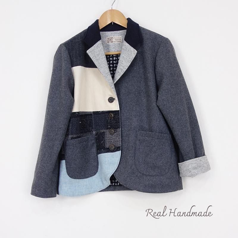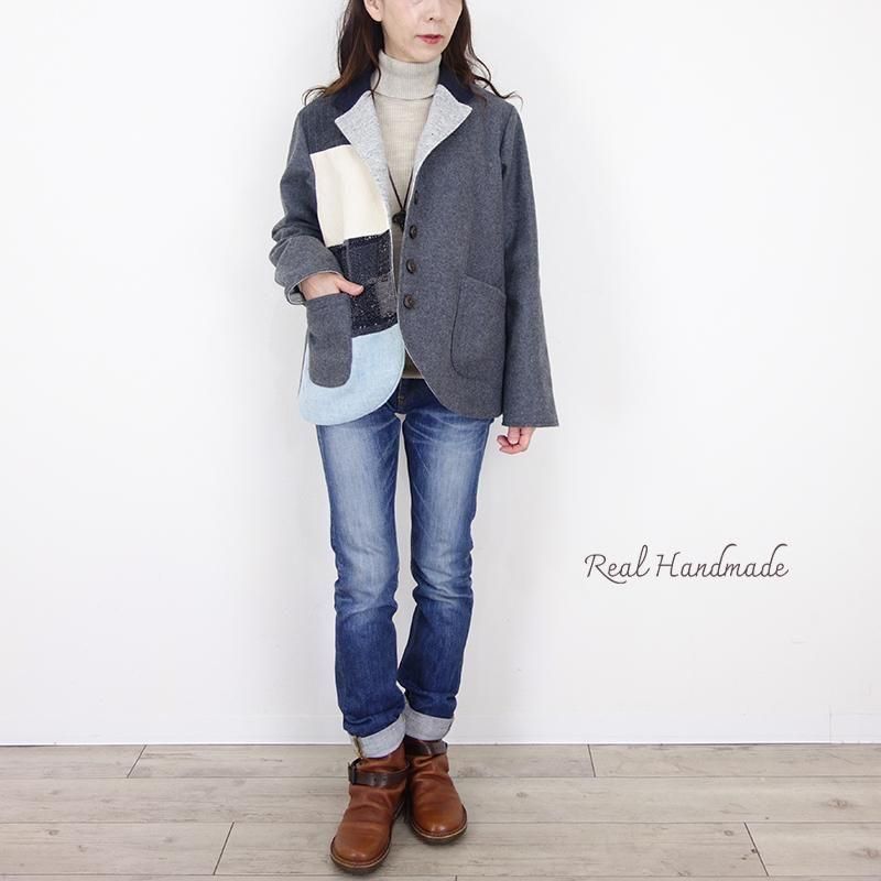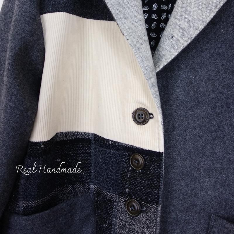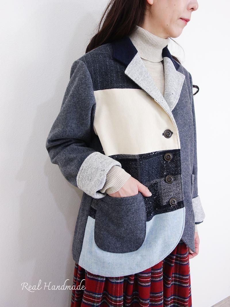 右前身頃にだけ多種類のツイードやコーデュロイを丁寧に組み合わせ、