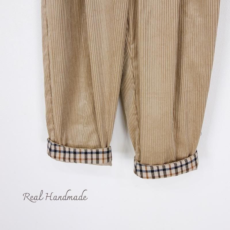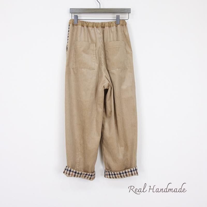 キャメルコーデュロイとクラシックチェックの裾タックふんわりパンツ