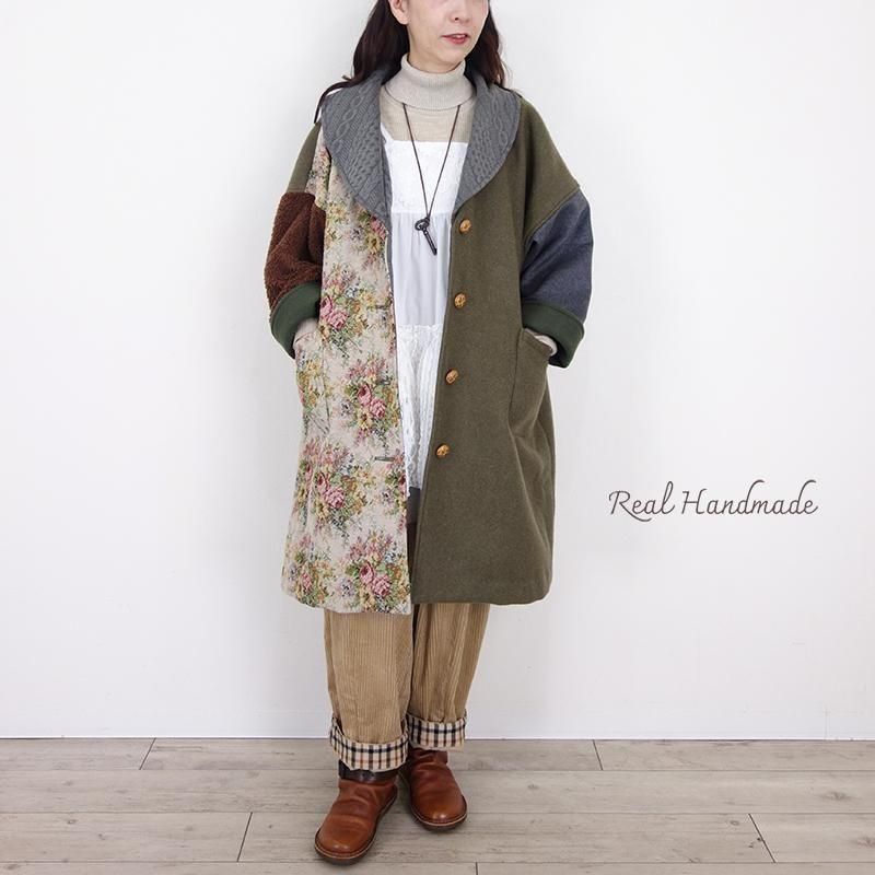 カーキウールとゴブラン織りのミックスショールカラーコート