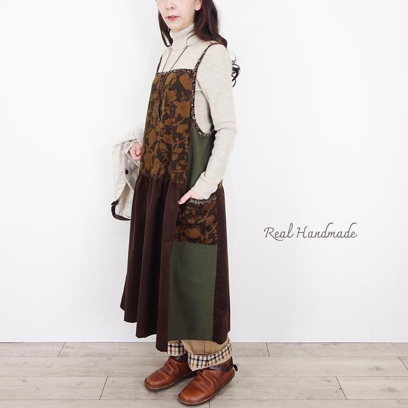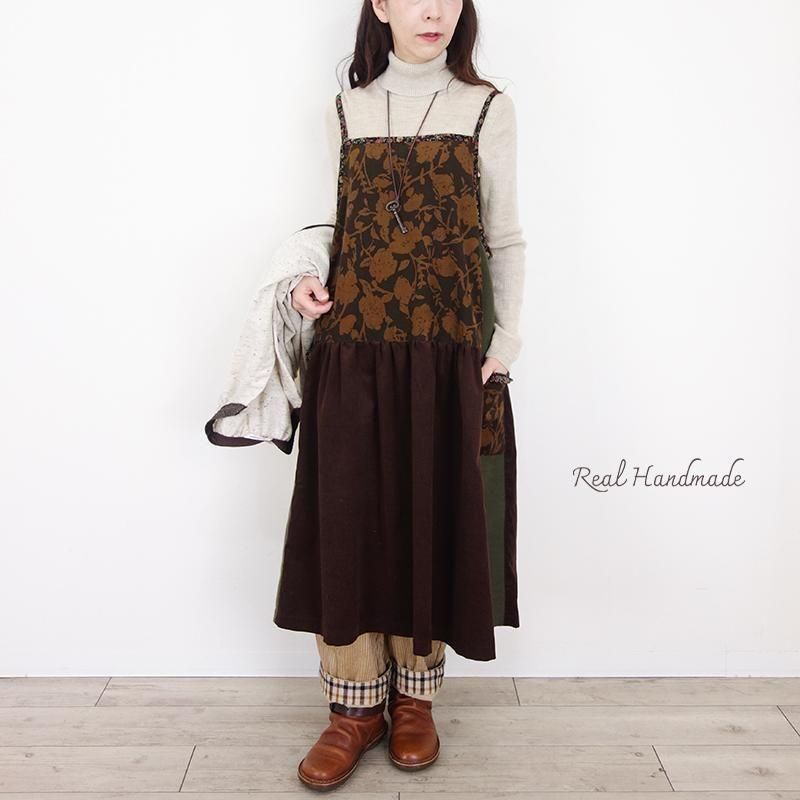 シルエットアートフラワーとブラウンコーデュロイのキャミワンピース